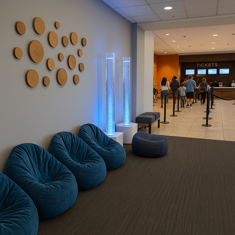 Our sensory waiting areas provide a calm alternative to long lines, designed to reduce stress for autistic individuals and their families. Featuring soft seating, bubble tubes, and calming lights, these spaces offer a soothing environment where guests can relax, self-regulate, and feel comfortable while waiting their turn.